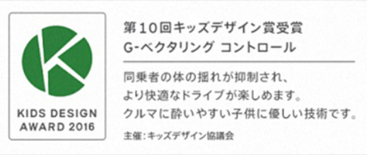 「G-Vectoring Control 加速度矢量控制系统」因具有「以人为本,通过研究人体工学来探讨汽车的理想形态」这一创新思维,而荣获「日本第10届儿童设计大奖(Kids Design Award)」。