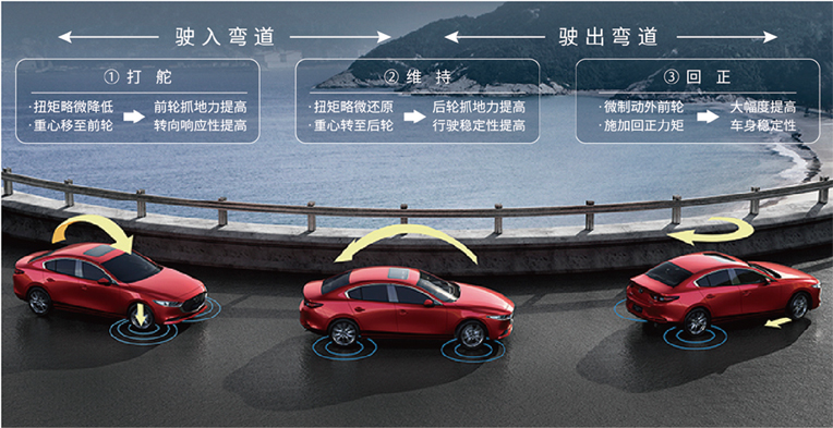 系统实时监测驾驶者操舵动作,计算合适的重心移动量,并向发动机发送控制指令。 ·驶入弯道时,通过对发动机扭矩的微控,优化前轮负载,提高前轮抓地力和转向响应性。 ·驶出弯道时,通过对发动机扭矩的微控,优化后轮负载,提高后轮抓地力和行驶稳定性的同时, 新增的「回正力矩强化系统」,抑制过度转向,更进一步提高车辆可控性。