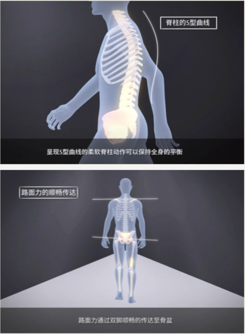基于人类步行特性的科学分析——保持头部稳定的2个身体奥秘 ①骨盆直立状态 + 脊柱呈现S型自然姿态 ②路面作用力顺畅无延迟地传递至骨盆