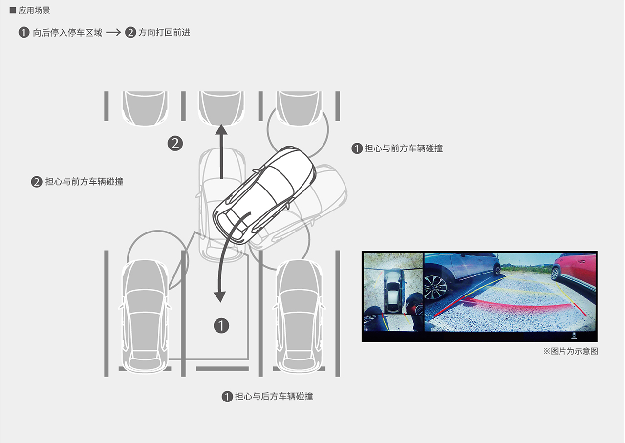 360度全景影像驻车辅助系统 充分利用车辆前后左右的4个摄像头,通过中央显示器的显示和各种警报音帮助在低速行驶和停车时确认车辆周边的情况。 顶部影像/前方影像/前方宽幅影像/侧面影像/后侧影像/后侧宽幅影像