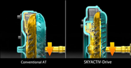 由于传统有级式自动变速箱(AT)的锁止离合器 只有当车速较高是才会进入锁止状态, 因此造成「低速域油耗」较高,「直接驱动感」不佳的问题。 (比如现款5AT的锁止范围为50%-60%)。 创驰蓝天自动变速箱SKYACTIV – DRIVE, 在保留有级式自动变速箱(AT)的液力变矩器启动快捷性的同时, 革命性在液力变矩器内设置了「多盘式锁止离合器」, 不通过流体,依靠机械咬合来传递扭力, 克服了车速提升之前发动机转速先上升的滑齿现象。 有效降低「低速域油耗」, 提高「直接驱动感」。