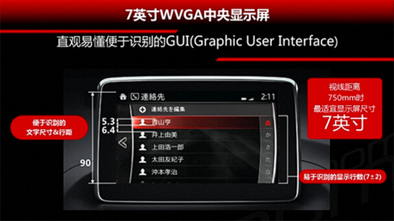 ③为了缩短读取信息的时间,我们充分考虑驾驶者与中央显示屏之间的距离,确定合适的文字大小与间距,并确定合理的显示屏尺寸,以准确显示信息。此外,选择菜单的数量等使用了心理学上的神奇数字7±2(研究发现,人类一次能够记住的项目不超过7±2),让驾驶者对显示内容一目了然。