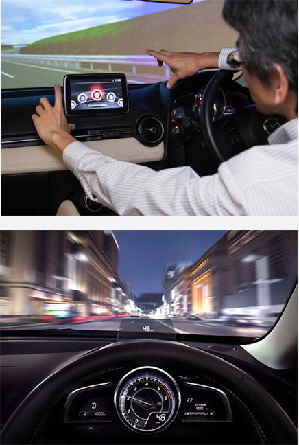 第二点是,「眼离路」即视线偏离前方道路。「这是指,有意识地将视线移向驾驶舱内显示的信息,也就是「视线偏离」。这样的视线偏离分为三个阶段。 ①视线偏离前方道路 ②视线对焦 ③读取所显示内容 将这三个阶段的所需时间最短化便是我们的第二项改进。 ①为了缩短视线的移动时间,我们将中央显示屏安排在上方,以避免妨碍驾驶者的视野。 在2013年的Mazda3 Axela昂克赛拉以及后续商品中,我们将驾驶者的俯视角缩小到15度, 以缩短视线的移动距离。 ②为了缩短视线焦点调节时间,我们开发了彩色平视显示系统(Active Driving Display)。 这是一款新型HMI,通过在人的有效视野范围内设置小型显示屏,让驾驶者可以在注视 前方道路的同时确认驾驶信息。通过虚像将驾驶信息显示在驾驶者前方约1.5m的位置, 尽可能地缩短对焦时间。