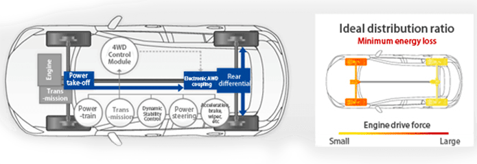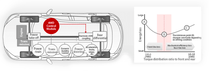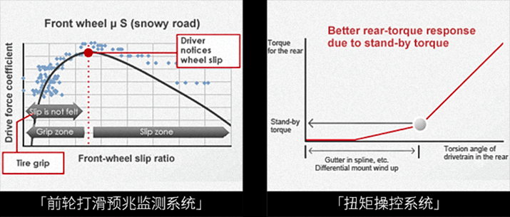 通过各种传感装置来高精度准确感应车辆的绝对速度和前轮速度,迅速察觉到前轮微小滑动(空转的预兆),瞬间向后轮分配合适的驱动力,在有效抑制前轮空转的同时,得益于理想的前后轮扭矩分配比,实现了高效率的四轮驱动驾驶。