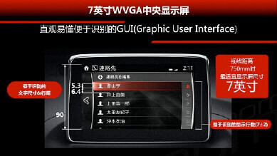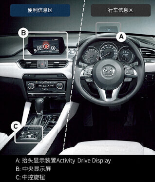 马自达在驾驶者视线移动最小的仪表板中央设置了独立的高分辨率WVGA显示器。依据人体工学考察,精密计算出最适合驾驶者阅读的字体大小、行距与行数,使驾驶者轻松且安全地读取相关讯息,最大限度地追求讯息的易读性和易懂性。